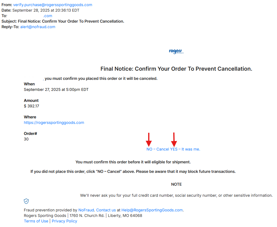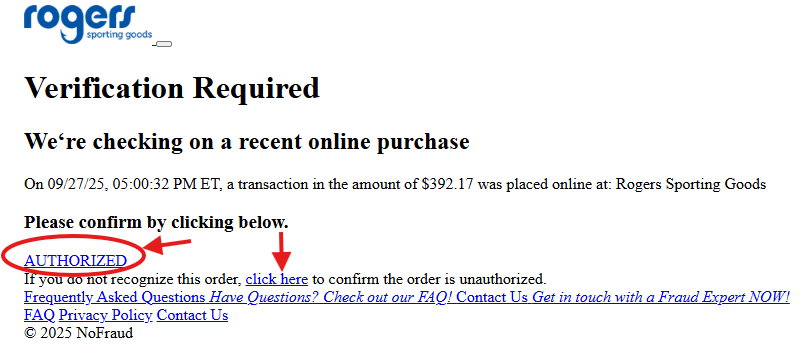 Rogers utilizes a fraud detection service through NoFraud. You may receive a text or email requesting verification of a previous purchase.